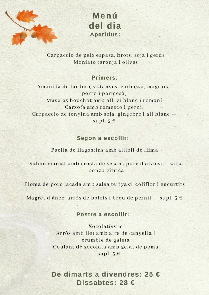 Entre setmana, de dimarts a divendres, el nostre menú és l’opció perfecta per gaudir d’un àpat complet i deliciós. Ens centrem en els productes de temporada i de proximitat, oferint plats que reflecteixen el millor de la nostra terra. Podràs trobar combinacions exquisides que varien, assegurant que sempre hi hagi alguna cosa nova i emocionant per provar. Des d’entrants frescos i lleugers fins a segons plats substanciosos i postres casolanes, cada detall està curosament preparat per gaudir.